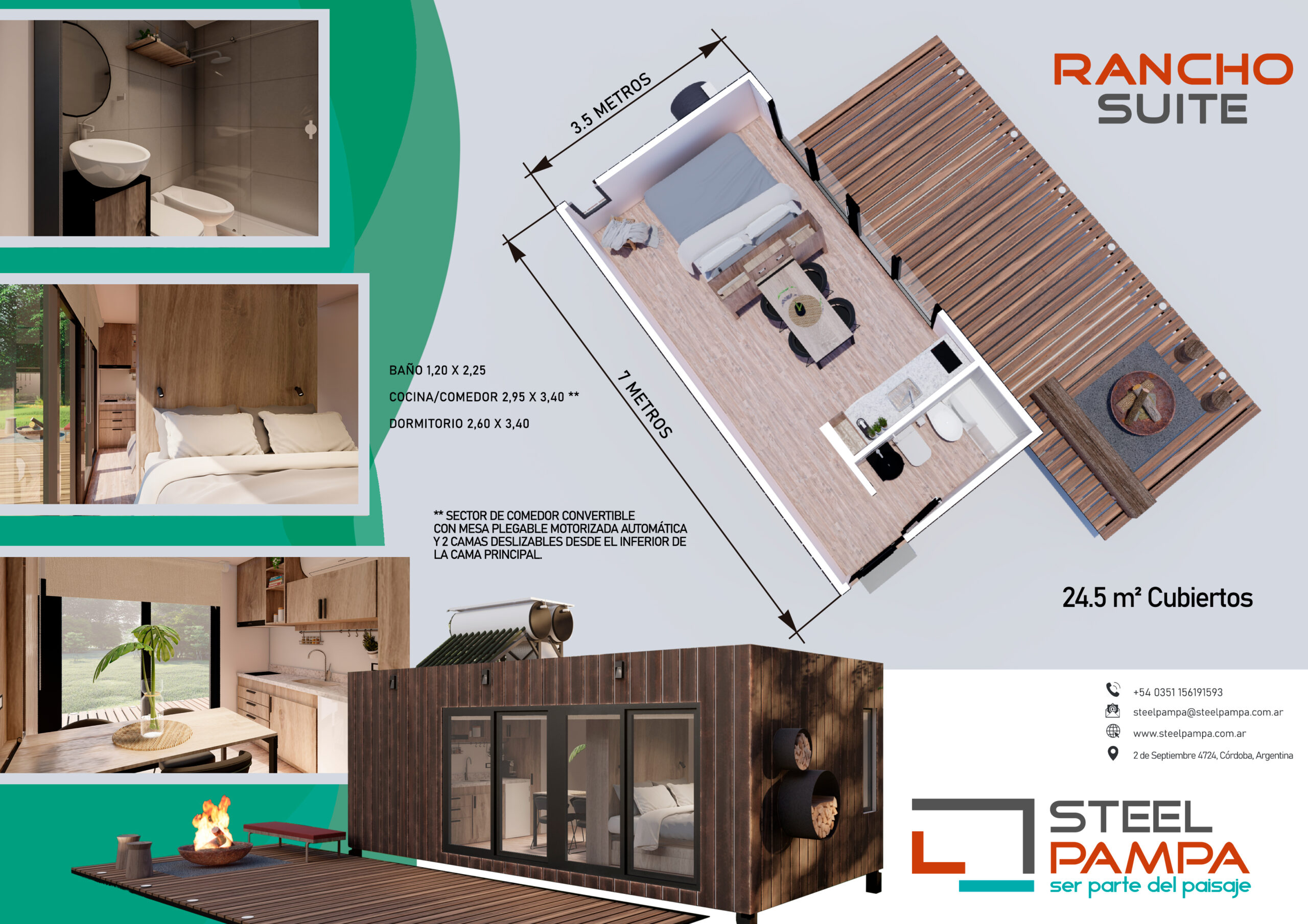 24,5 m con las comodidades que necesitas para disfrutar de tu paisaje favorito. Nuestro Rancho Suite es un módulo de alta eficiencia que sale de nuestra fábrica completamente equipado y terminado, listo para habitar.